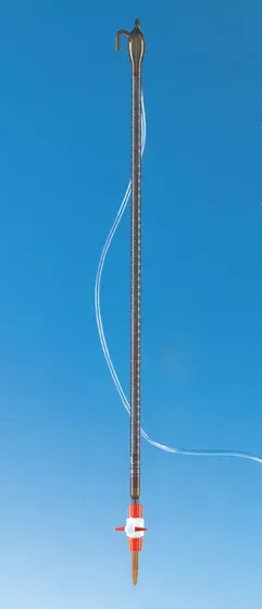 BLAUBRAND® AS osztályú automata büretta, DE-M25 ml: 0,05 ml, 3,3-as borostyán színű menetes szelep, PTFE fokozatú fehér elzárócsappal, műanyag töltőcsővel együtt