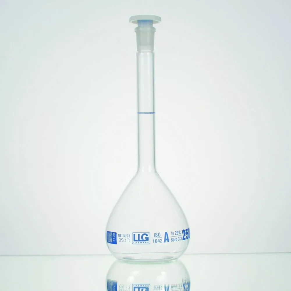 LLG mérőlombik 200 ml, boroszilikát 3,3, átlátszó, A osztály, NS 14/23, PE dugóval, kék skála, gyártási tanúsítvánnyal, 2 db-os csomag