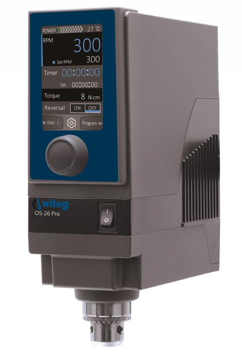 | Rövid leírás a termékről | WITEG OS-26 digitális felső keverő. Max viszkozitás 70.000 mPa, fordulatszám 30-2000 ford/perc, nyomaték 130 Ncm, időzítő 0-99 óra 59 perc, keverőszár max 10 mm. Digitális szabályzás, beállított, és mért sebesség kijelzés, nyomaték kijelzés. Lágyindítás, és motorvédelem. A csomag tartalmaz egy OS-26 keverőt, egy állványt kettősdióval, valamint két keverőszárat.