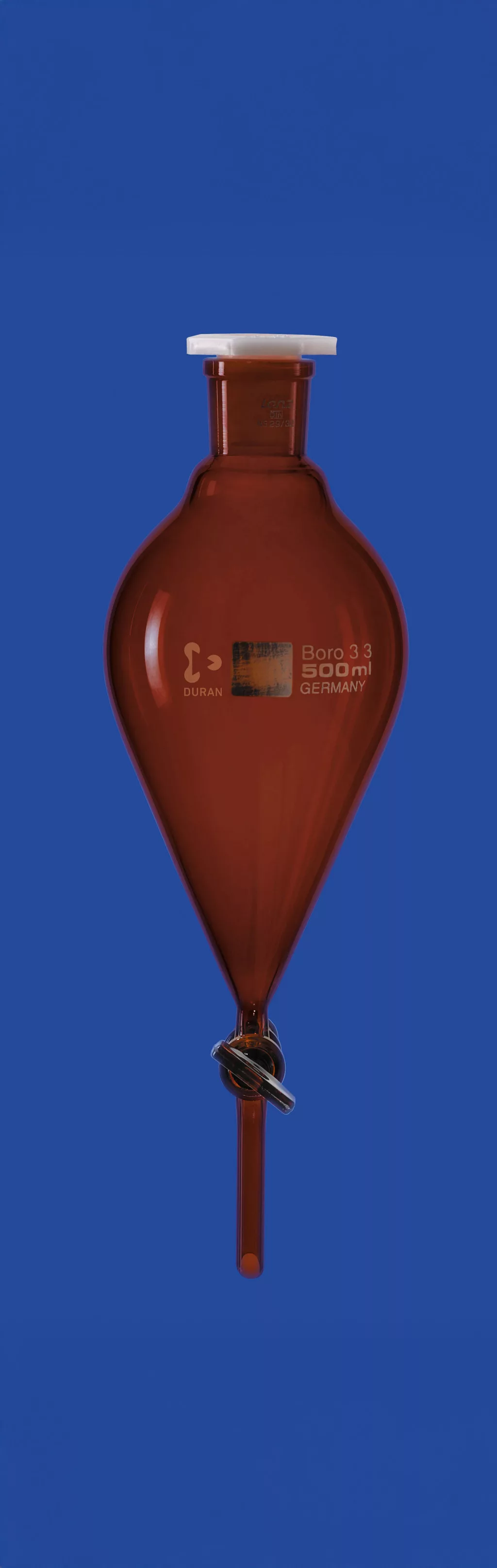 Elválasztó tölcsér, Csiszolat kúpos, tömör üveg dugó, 500 ml, NS 29/32, furat 4,0 mm, borostyánsárga, skála nélkül, boroszilikát üveg 3.3