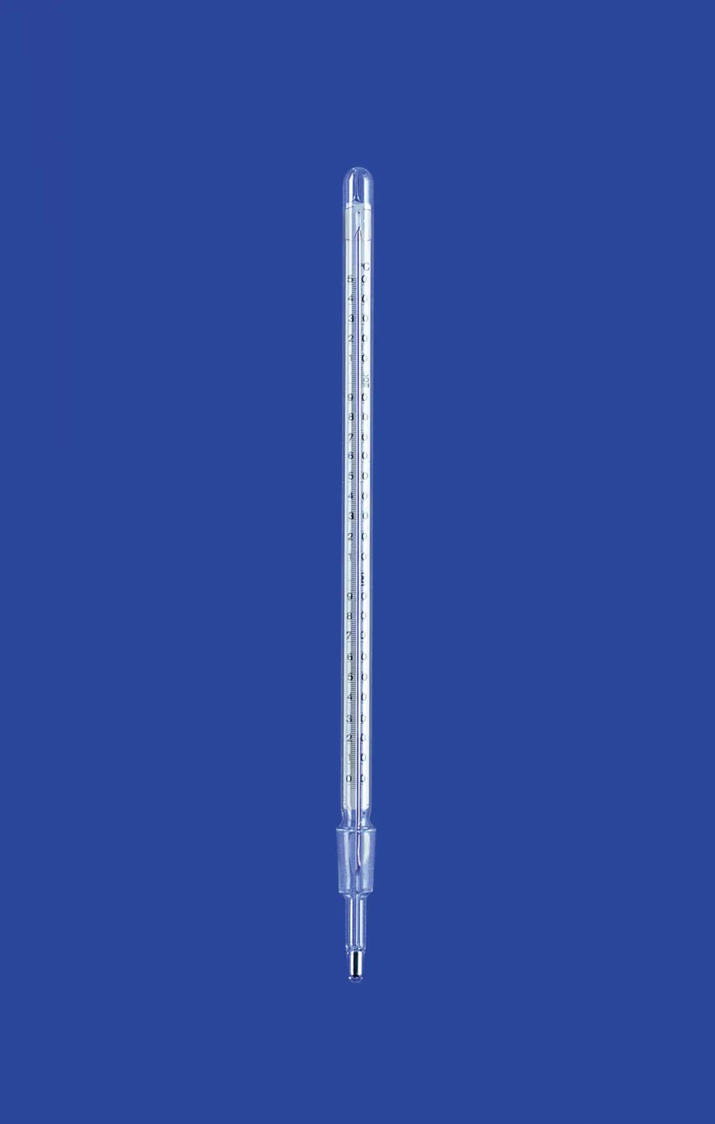 Desztillációs hőmérő Csiszolat kúpos NS 14/23, 0 - 250 °C, töltet: izoamil-benzoát, skála 1°C, beépített hossz 55 mm