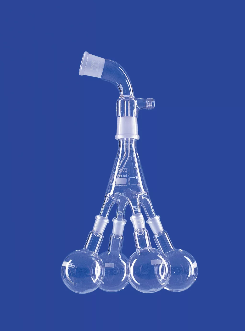 Desztilláló gyűjtő a Bredt szerint,egyenes,felső foglalat NS29/32,középcsonk.foglalat/ kúp NS29/32,vákuumcsatlakozó .GL18,4 lombikkal